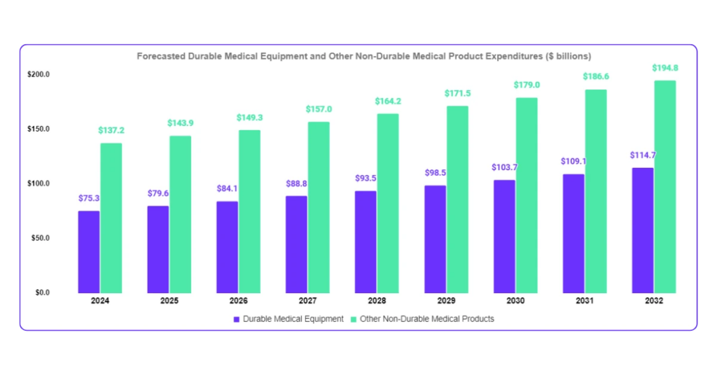 Adding to the strain is the growing cost of Durable Medical Equipment (DME). Expenditures on DME are projected to increase by 46.26% by 2030, reaching $32.8 billion (CMS).